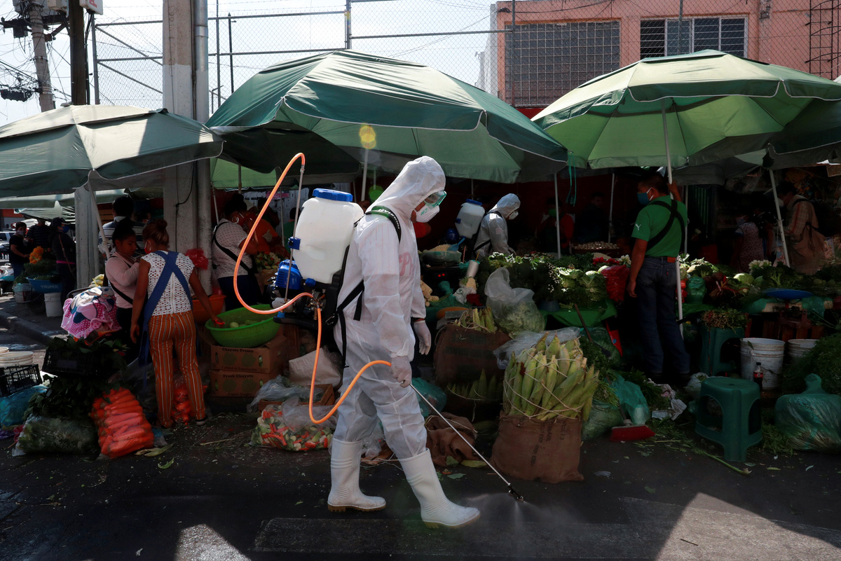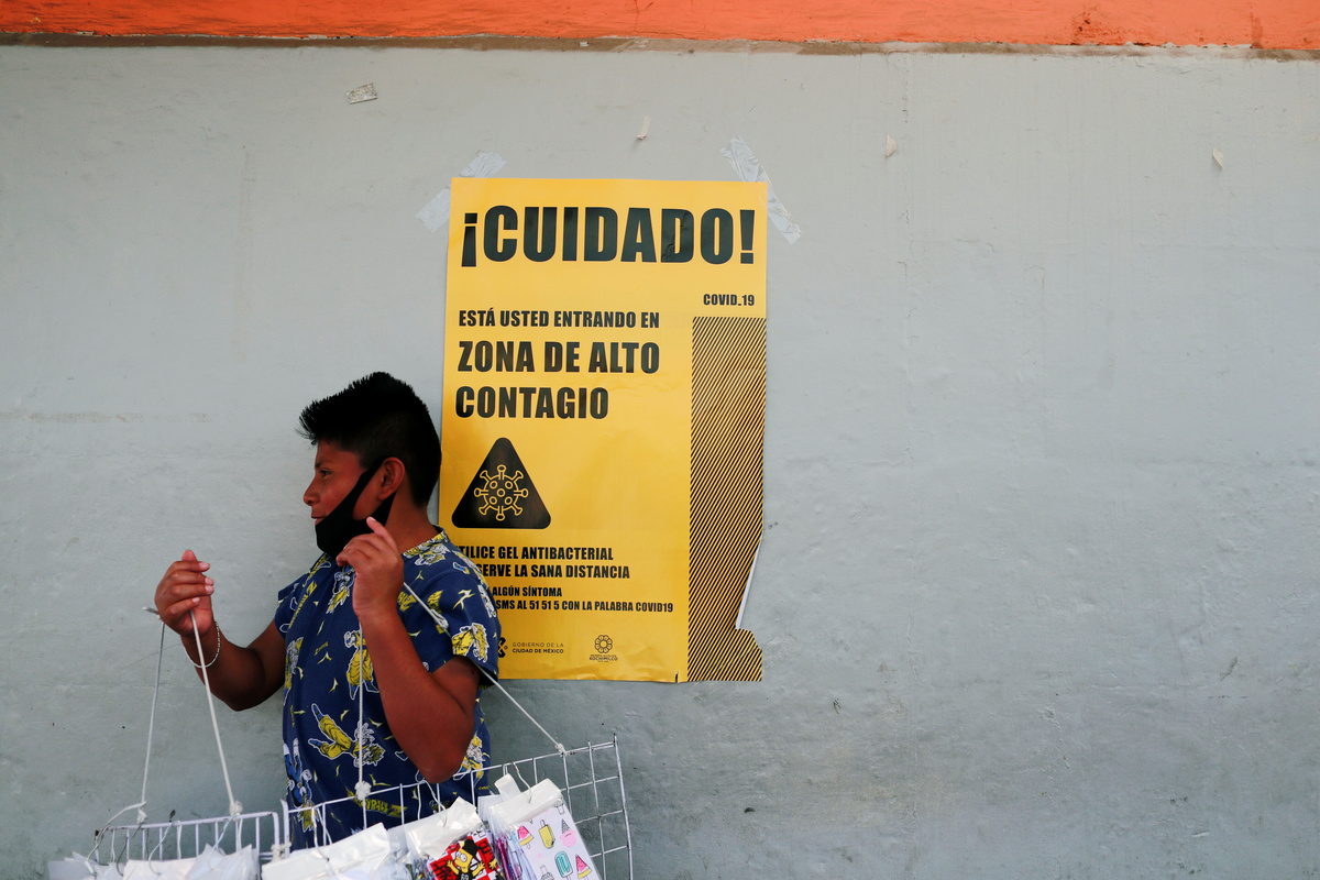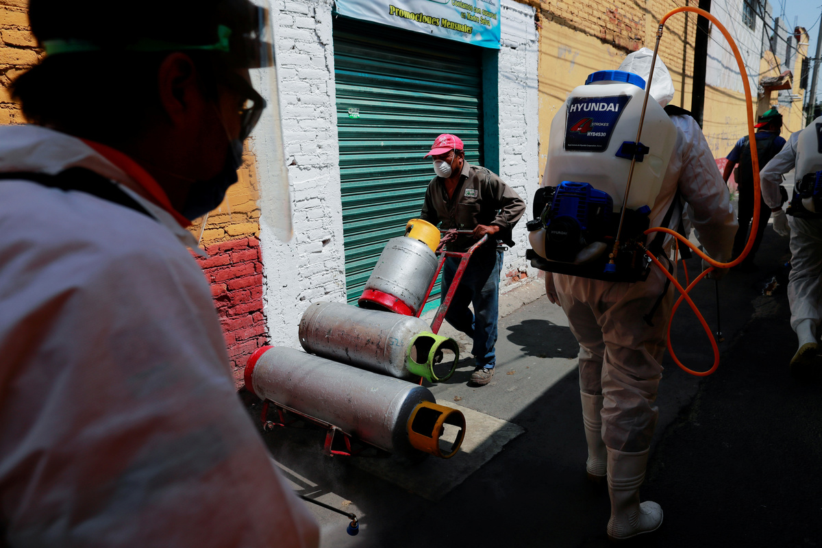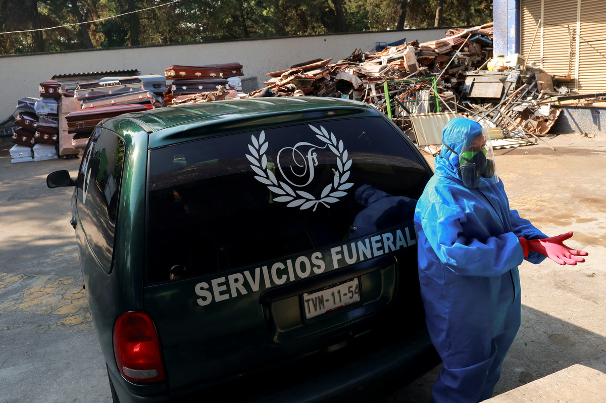 Black smoke is seen from outside a crematorium, as the outbreak of the coronavirus disease (COVID-19) continues in Mexico City, Mexico May 5, 2020. REUTERS/Carlos JassoCoffins are seen as a man wearing a protective face mask stands outside a crematorium, as the outbreak of the coronavirus disease (COVID-19) continues in Mexico City, Mexico May 5, 2020. REUTERS/Carlos JassoA funeral worker wearing personal protective equipment stands outside a crematorium, as the outbreak of the coronavirus disease (COVID-19) continues in Mexico City, Mexico May 5, 2020. REUTERS/Carlos JassoA municipality employee, wearing protective gear, disinfects the outside of the local market, as the outbreak of the coronavirus disease (COVID-19) continues in Xochimilco, Mexico City, Mexico May 5, 2020. REUTERS/Carlos JassoFILE PHOTO: A man stands behind a fence of the triage for the coronavirus disease (COVID-19) patients as the spread of COVID-19 continues in Mexico City, Mexico May 4, 2020. REUTERS/Carlos JassoA gas vendor is seen as municipality employees, wearing protective gear, disinfect the area, as the outbreak of the coronavirus disease (COVID-19) continues in Xochimilco, Mexico City, Mexico May 5, 2020. REUTERS/Carlos JassoA street vendor is seen outside the local market, as the outbreak of the coronavirus disease (COVID-19) continues in Xochimilco, Mexico City, Mexico May 5, 2020. Sign reads "Careful, You are entering a high contagion zone". REUTERS/Carlos JassoPeople wait for a bus as municipality employees, wearing protective gear, disinfect the area, as the outbreak of the coronavirus disease (COVID-19) continues in Xochimilco, Mexico City, Mexico May 5, 2020. REUTERS/Carlos JassoA journalist wearing a protective mask stands by a wall, as the outbreak of the coronavirus disease (COVID-19) continues in Xochimilco, Mexico City, Mexico May 5, 2020. REUTERS/Carlos Jasso