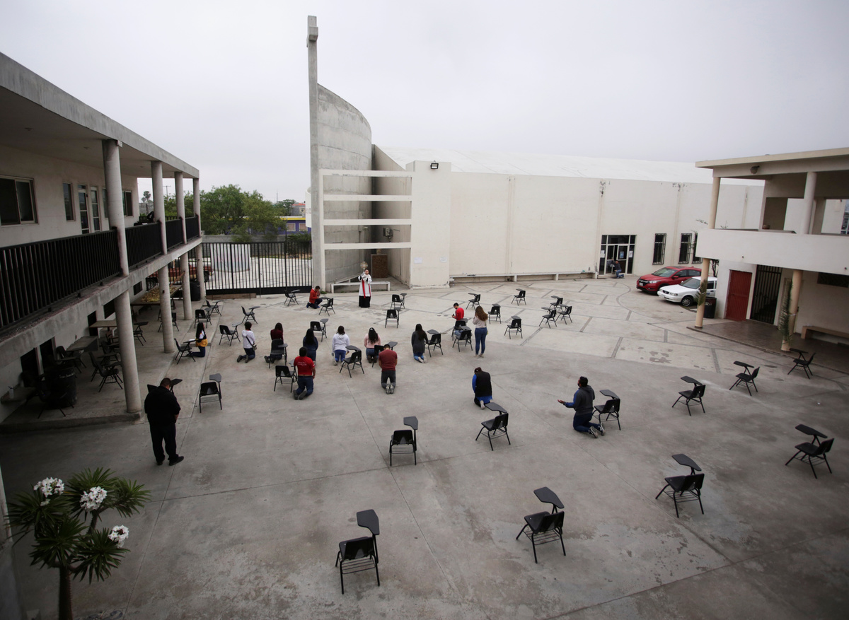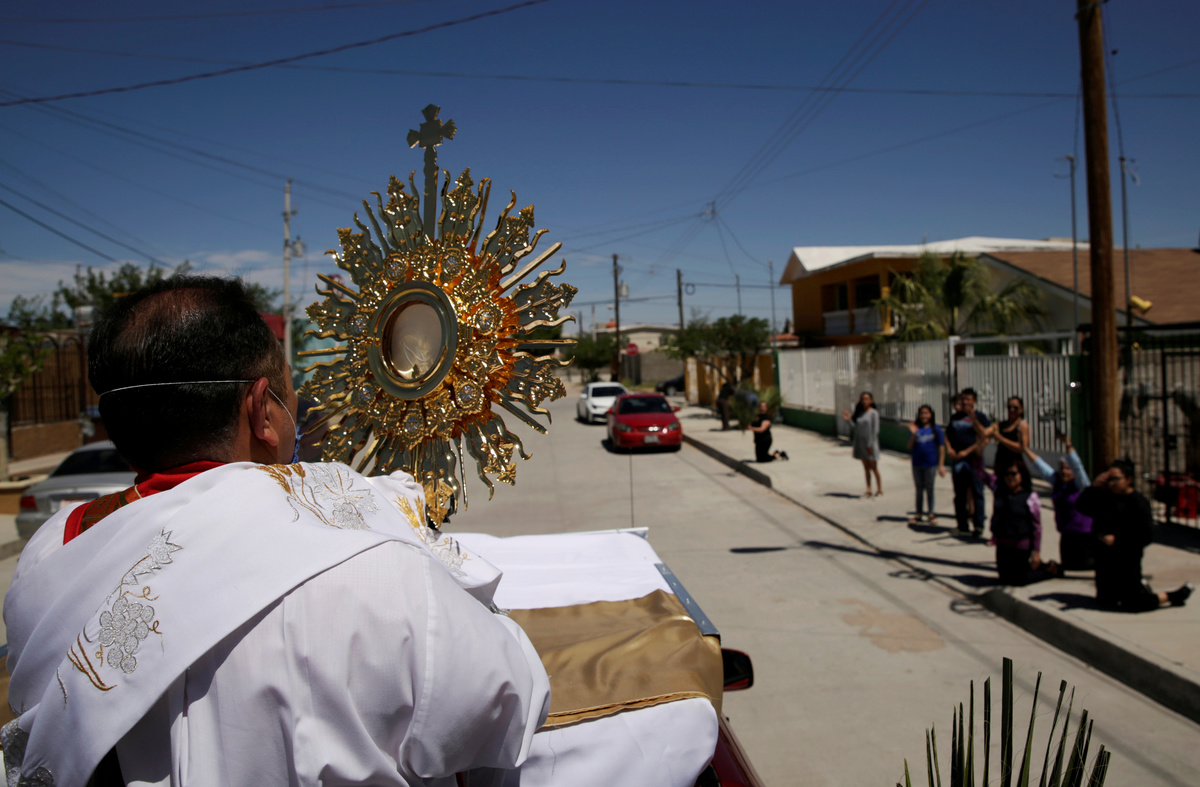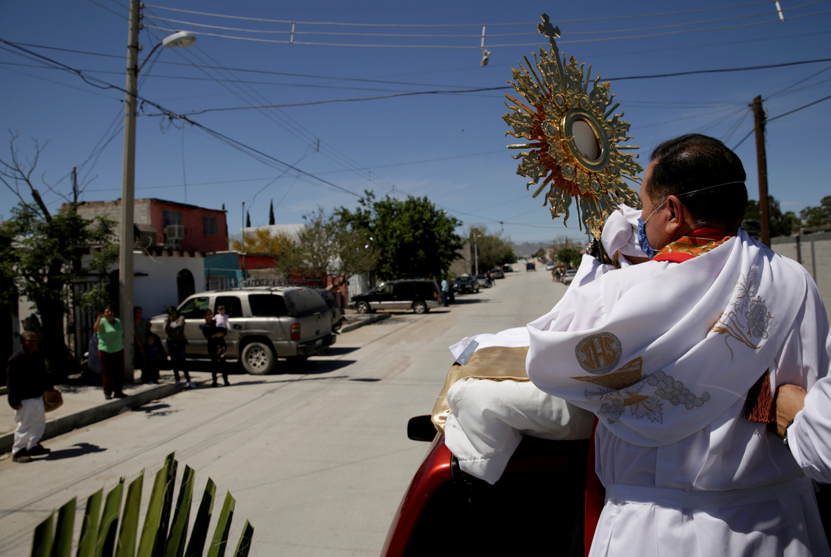 Mexican priest Manuel Dorante, riding on the back of a pick-up truck, blesses faithfuls along the streets during Palm Sunday, after Mexico's government declared a health emergency and issued stricter rules to contain the spread of the coronavirus disease (COVID-19), in Ciudad Juarez, Mexico, April 5, 2020. REUTERS/Jose Luis Gonzalez Mexican priest Manuel Dorante, riding on the back of a pick-up truck, blesses faithfuls along the streets during Palm Sunday, after Mexico's government declared a health emergency and issued stricter rules to contain the spread of the coronavirus disease (COVID-19), in Ciudad Juarez, Mexico, April 5, 2020. REUTERS/Jose Luis Gonzalez