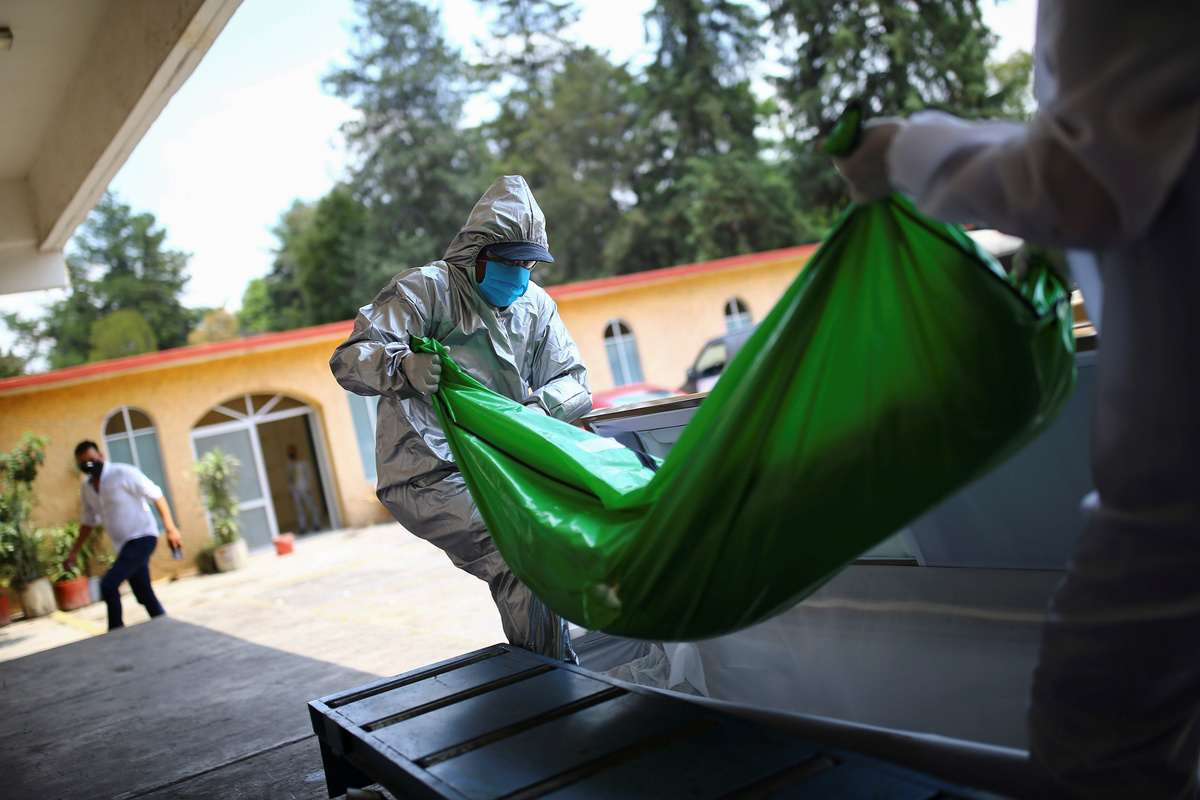 Crematorium employees put a bag on a stretcher containing the body of Angel, who died from the coronavirus disease (COVID 19), at San Isidro crematory in Mexico City, Mexico June 29, 2020. REUTERS/Edgard Garrido