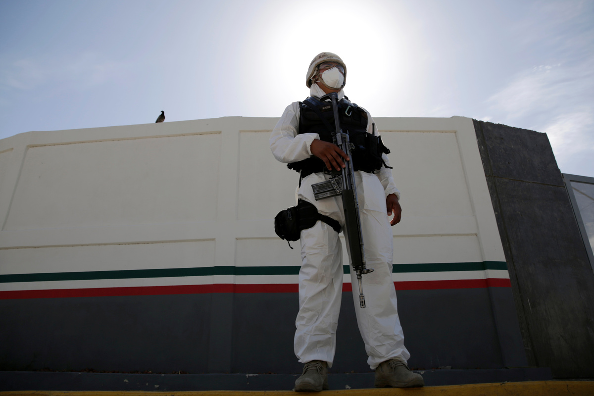 Mexican soldier stands guard as travelers enter to Ciudad Jurez, Mexico from the United States through the Stanton-Lerdo international bridge to prevent contagion due to the coronavirus disease (COVID-19) in Ciudad Juarez, Mexico July 4, 2020. REUTERS/Jose Luis Gonzalez