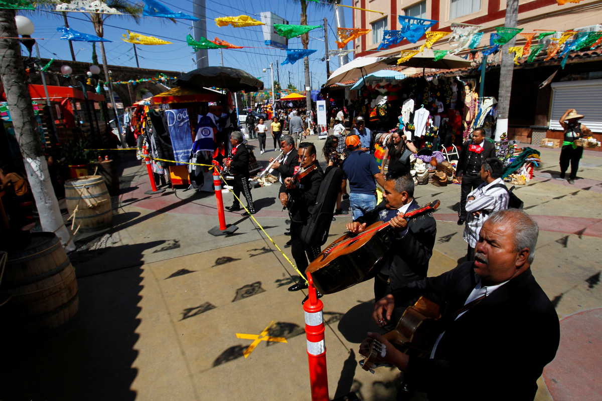 Traditional Mariachi musicians play music for residents and tourist behind a cordon for social distancing in the city center, as the coronavirus disease (COVID-19) outbreak continues, in Tijuana, Mexico July 4, 2020.REUTERS/Jorge Duenes