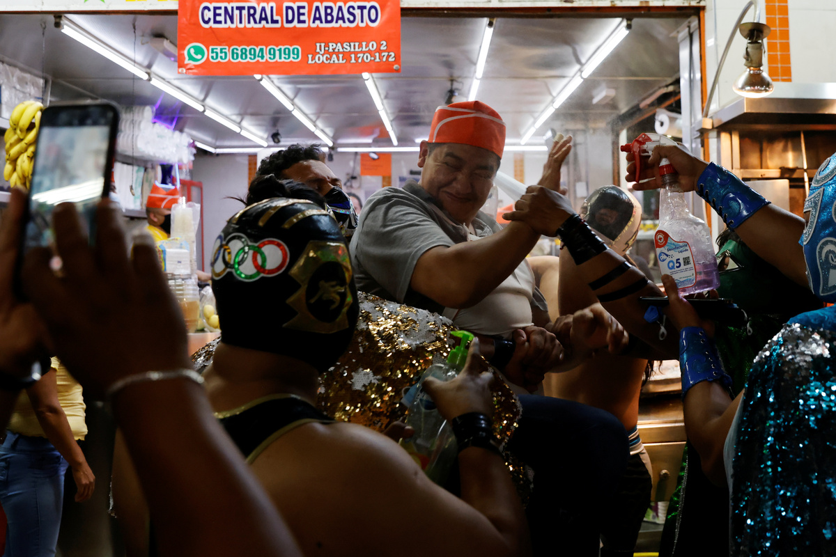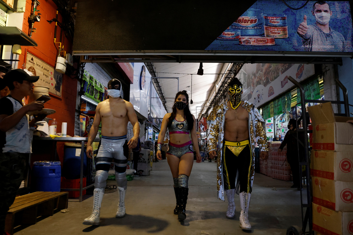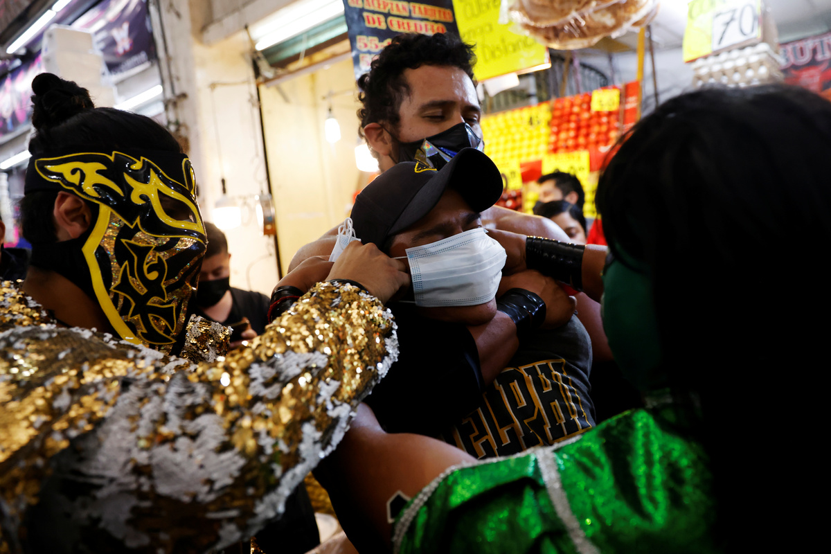 Mexico's famous lucha libre wrestlers turned Latin America's largest wholesale food market into a battleground against COVID-19 this week, barging down walkways to urge people to wear masks to contain the virus.