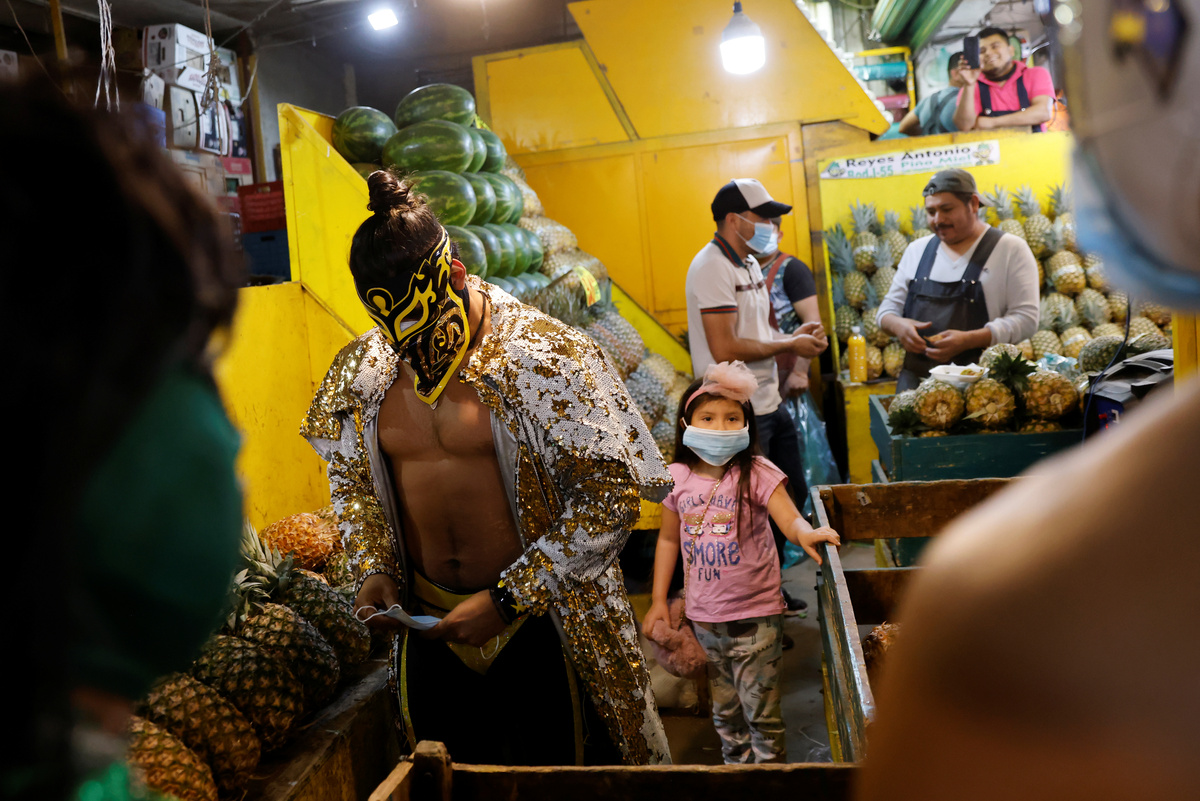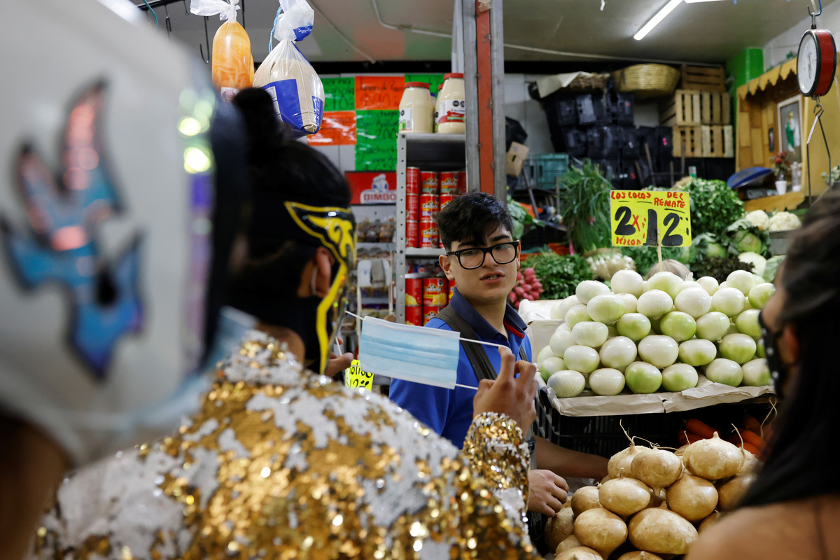 "Put on a mask!" a group of wrestlers in traditional outfits urged buyers and sellers in the bustling thoroughfares of Mexico City's sprawling Central de Abasto market. "Be responsible!"