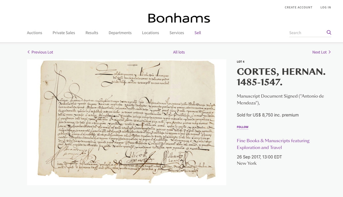 Bonhams, Christie's and Nate D. Sanders also auctioned one Cortés document each in 2017, according to the academics and information on Bonhams and Christie's websites.