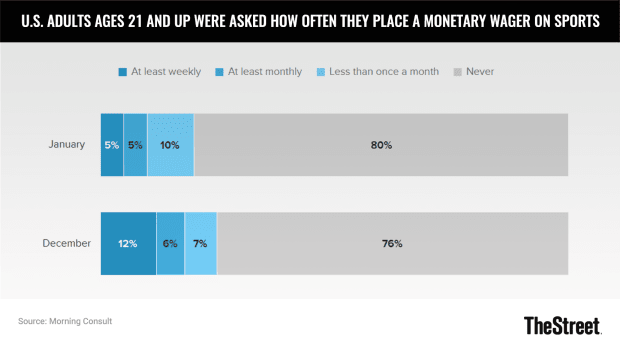 Nearly 20% of U.S. adults 21 and older said they bet on sports at least once a month, including online wagering, according to a December survey. That number was up 80% from January 2021.