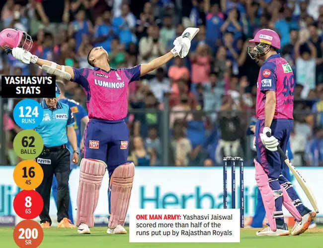 MUMBAI: Yashasvi Jaiswal’s maiden IPL hundred against the Mumbai Indians at the Wankhede Stadium on Sunday night must rate amongst the best centuries in the IPL. That it came in the 1000th IPL match couldn’t have been more apt. However, it took just three balls of magic from Tim David to turn it into a vain effort in a losing cause.