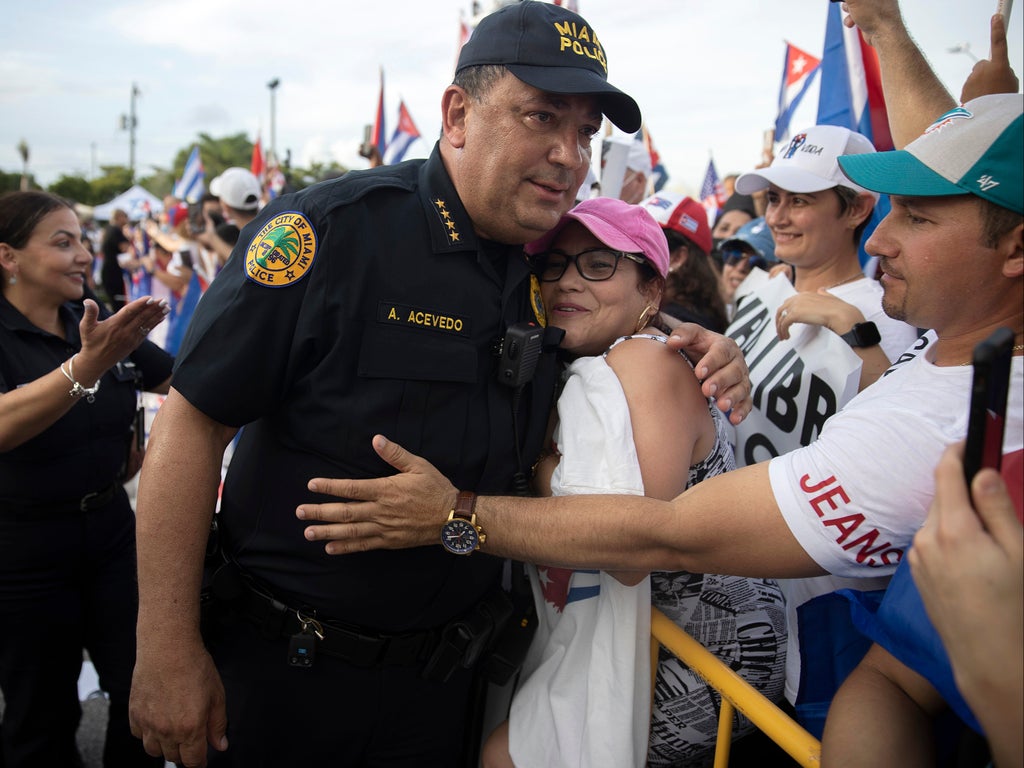 The police chief of Miami marched with demonstrators in the city to protest the Cuban government, hugging and consoling activists hoping to see the regime change in the island nation.