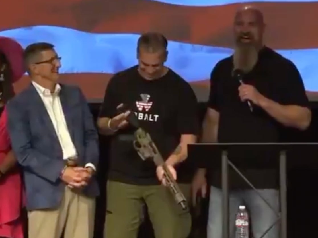 Flynn appeared at the “Church of Glad Tidings” in Yuba City, California over the weekend, where church-members presented the now-pardoned general with a semi-automatic weapon. “We were trying to come up with a rifle that we thought was appropriate for a general, so we went with an old-school Woodland camouflage ... one of our top-quality guns,” a member announced upon handing Flynn what appears to be a Woodland Camp AR-15.