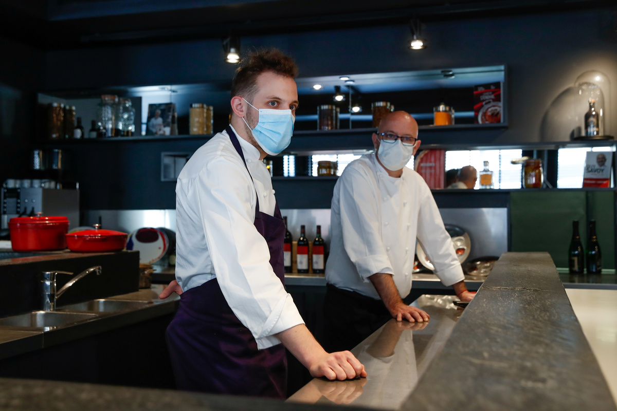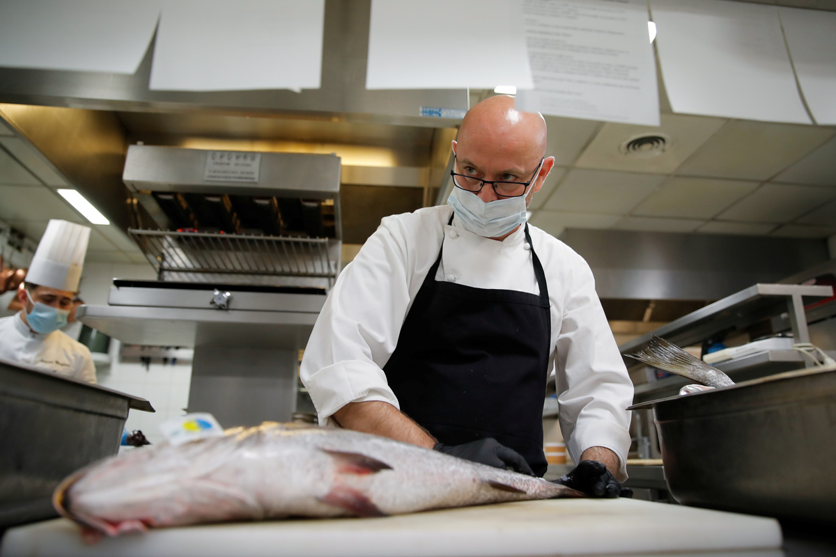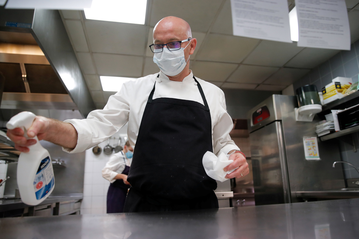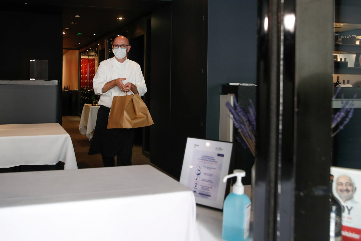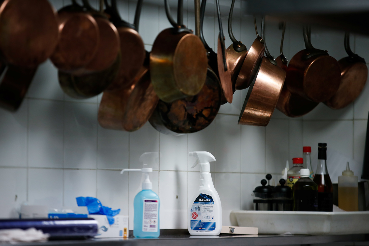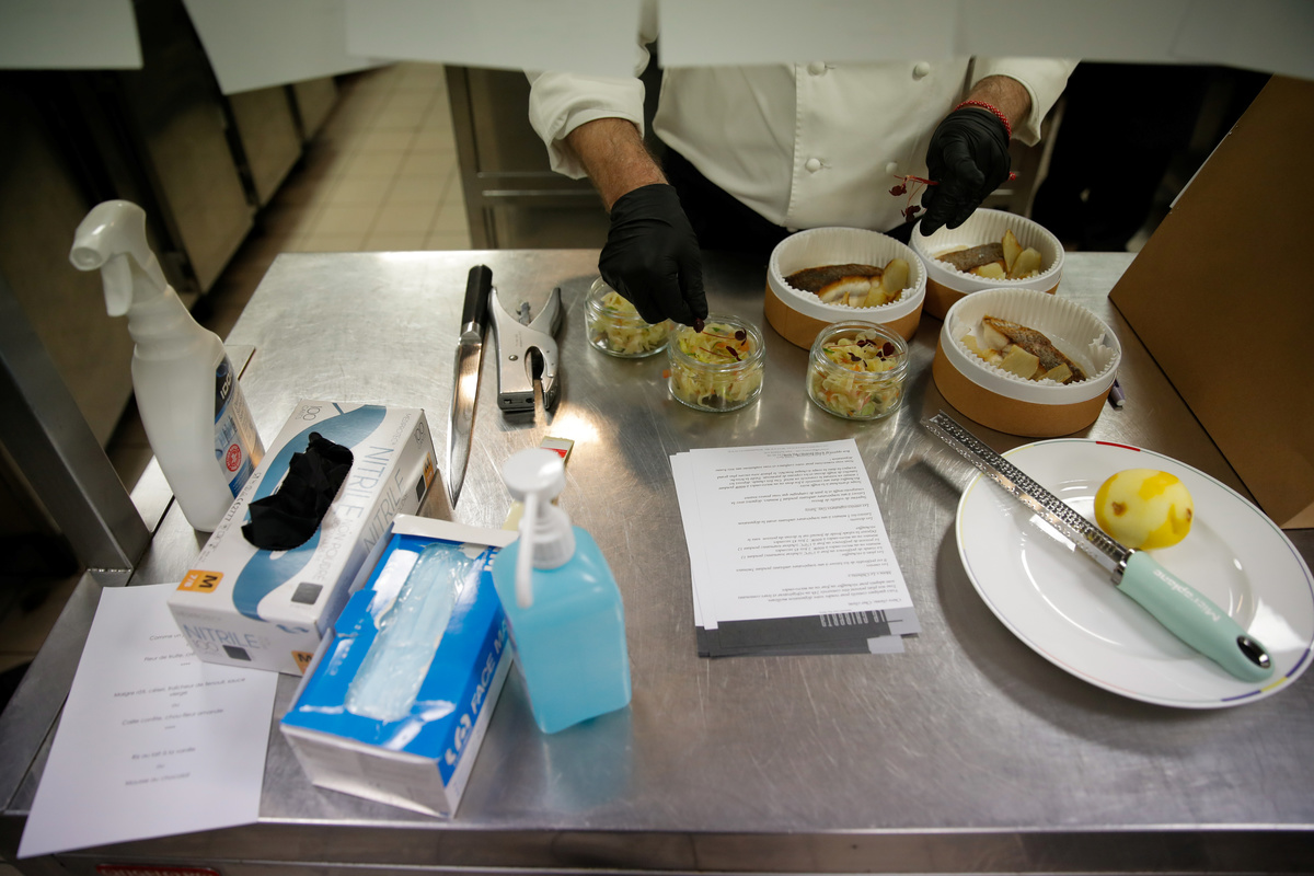 Chefs Irwin Durand and Gilles Chesneau, wearing protective face masks, pose as they prepare takeaway menus at Michelin-starred restaurant Le Chiberta in Paris before the announcement by the French government of more easing lockdown measures to allow the reopening of restaurants as soon as possible following the outbreak of the coronavirus disease (COVID-19) in France, May 27, 2020. REUTERS/Gonzalo FuentesChef Gilles Chesneau, wearing a protective face mask, prepares takeaway menus at Michelin-starred restaurant Le Chiberta in Paris before the announcement by the French government of more easing lockdown measures to allow the reopening of restaurants as soon as possible following the outbreak of the coronavirus disease (COVID-19) in France, May 27, 2020. REUTERS/Gonzalo FuentesChef Gilles Chesneau, wearing a protective face mask, delivers a menu at Michelin-starred restaurant Le Chiberta in Paris before the announcement by the French government of more easing lockdown measures to allow the reopening of restaurants as soon as possible following the outbreak of the coronavirus disease (COVID-19) in France, May 27, 2020. REUTERS/Gonzalo FuentesBottles of disinfectant and hydroalcoholic solution are seen in the kitchen at Michelin-starred restaurant Le Chiberta in Paris before the announcement by the French government of more easing lockdown measures to allow the reopening of restaurants as soon as possible following the outbreak of the coronavirus disease (COVID-19) in France, May 27, 2020. REUTERS/Gonzalo FuentesChef Quentin, wearing a protective face mask, prepares takeaway menus at Michelin-starred restaurant Le Chiberta in Paris before the announcement by the French government of more easing lockdown measures to allow the reopening of restaurants as soon as possible following the outbreak of the coronavirus disease (COVID-19) in France, May 27, 2020. REUTERS/Gonzalo FuentesChef Gilles Chesneau, wearing a protective face mask, prepares takeaway menus at Michelin-starred restaurant Le Chiberta in Paris before the announcement by the French government of more easing lockdown measures to allow the reopening of restaurants as soon as possible following the outbreak of the coronavirus disease (COVID-19) in France, May 27, 2020. REUTERS/Gonzalo FuentesChef Gilles Chesneau, wearing a protective face mask, disinfects the work table at Michelin-starred restaurant Le Chiberta in Paris before the announcement by the French government of more easing lockdown measures to allow the reopening of restaurants as soon as possible following the outbreak of the coronavirus disease (COVID-19) in France, May 27, 2020. REUTERS/Gonzalo Fuentes