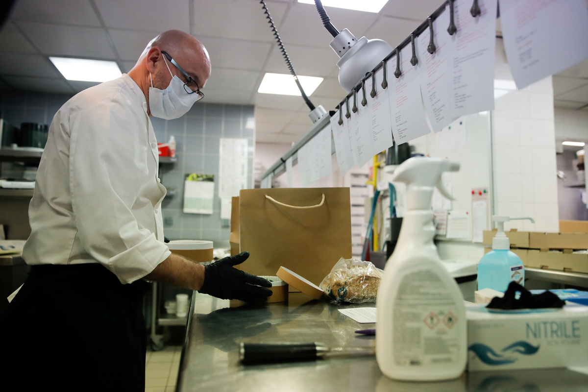 Chef Gilles Chesneau prepares takeaway menus at Michelin-starred restaurant Le Chiberta in Paris before the announcement by the French government of more easing lockdown measures to allow the reopening of restaurants as soon as possible following the outbreak of the coronavirus disease (COVID-19) in France, May 27, 2020. REUTERS/Gonzalo Fuentes