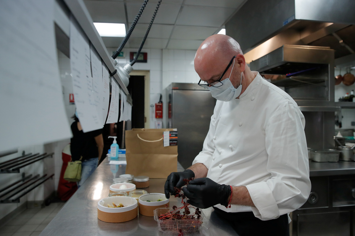 Chef Gilles Chesneau wearing a protective face mask prepares takeaway menus at Michelin-starred restaurant Le Chiberta in Paris before the announcement by the French government of more easing lockdown measures to allow the reopening of restaurants as soon as possible following the outbreak of the coronavirus disease (COVID-19) in France, May 27, 2020. REUTERS/Gonzalo Fuentes