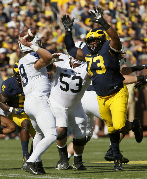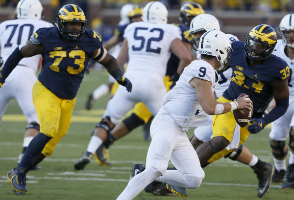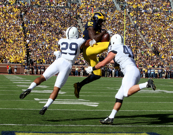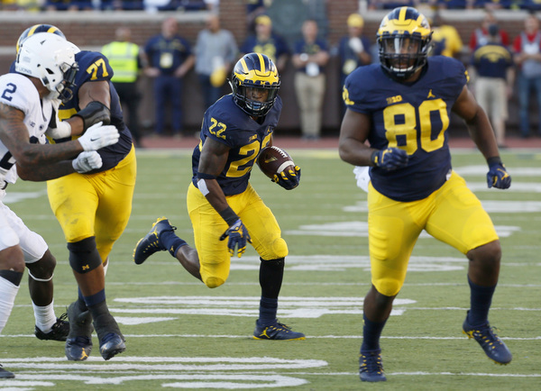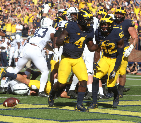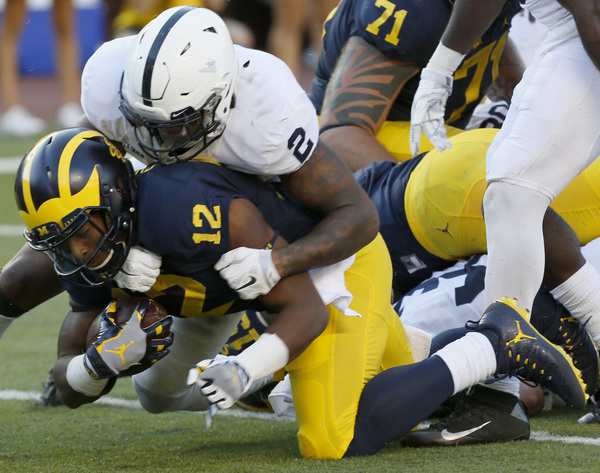 After Jourdan Lewis made his emphatic return with a solid tackle on a fourth-down Penn State bubble screen, the Wolverines march 54 yards with relative ease, capped by the second rushing touchdown of the game, this one from De'Veon Smith for the 14-0 lead.