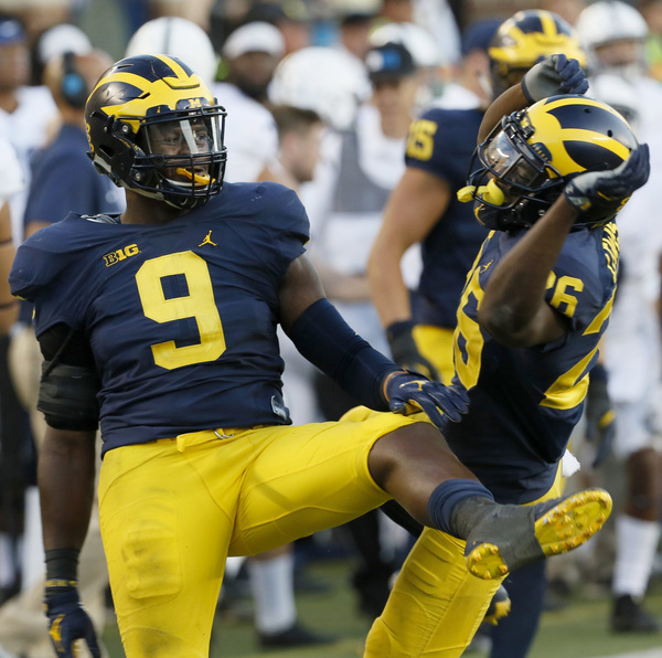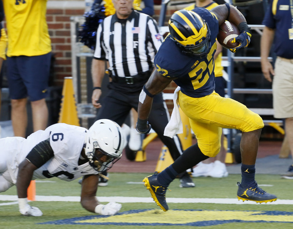 He got his 107 on just 12 carries, his longest a 39-yarder, tearing apart the Penn State rushing defense (2-2). Later, he was joined in the explosion category by Chris Evans (one touchdown) and Karan Higdon (two touchdowns), who each had runs of at least 37 as well.