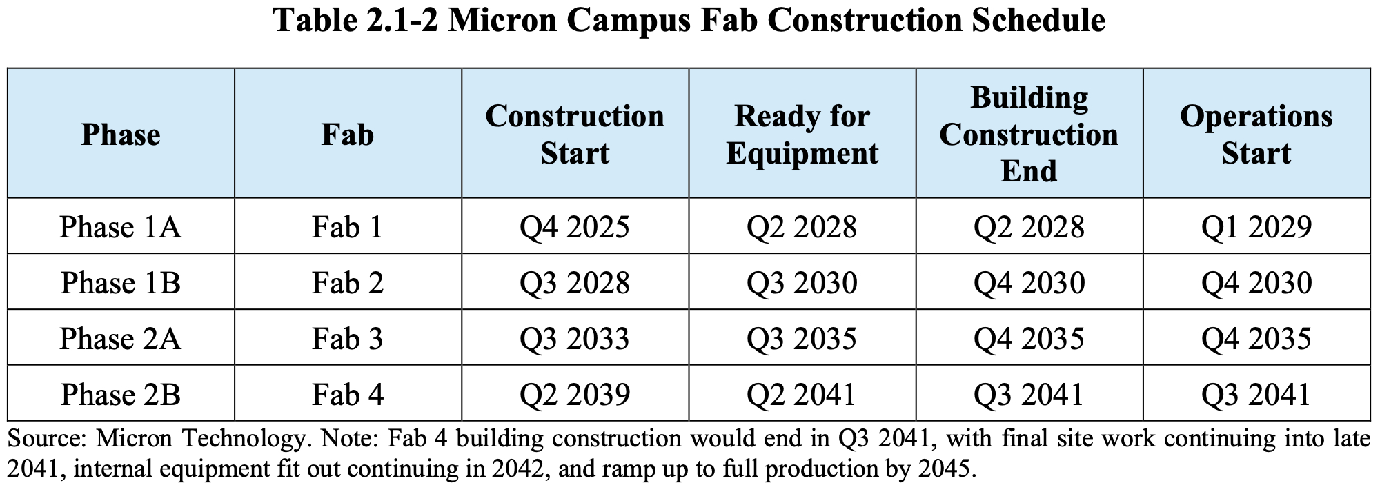 The same environmental documentation pins Fab 2's construction start to the second half of 2028, Fab 3's construction start to the second half of 2033, and Fab 4's construction start to the first half of 2039. This way, the Micron Clay campus will be fully built and ramped to full production by 2045, which is five years behind schedule.