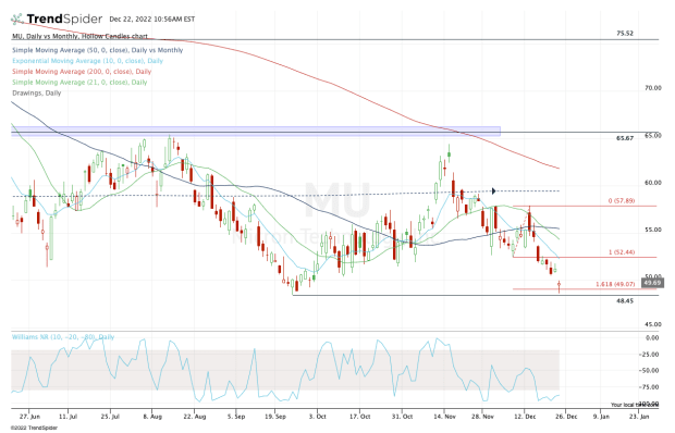 If Micron stock can’t hold this area, then the $45 to $46 area could be in play. There we find the 78.6% retracement from the all-time high down to the covid 2020 low.