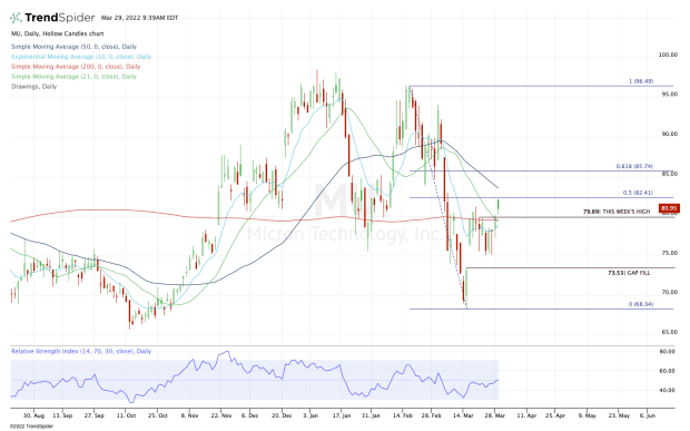 Near today’s high, Micron stock was trading near the middle of its current range — right near the 50% retracement.