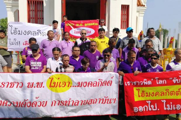 A group of Phitsanulok Pitthayakhom School alumni on Saturday converged on the King Nareusuan the Great shrine at Chan Royal Place in Phitsanulok, with some carrying placards denouncing Mr Monkolkit for his remarks.