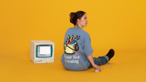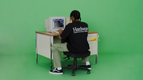 Hardwear’s minimal design allows its pieces to blend effortlessly into anyone’s wardrobe, echoing Mathieu’s belief that anyone can be (and dress like) a creator. Photographed in a setting reminiscent of Microsoft’s iconic desktop background, the capsule’s campaign highlights gray “Hardwear”-branded sweatsuits and MS Paint-inspired tees amongst old PCs and computer mice. Graphic tees boast sayings like “never not creating” and “it’s in you, not on you,” to emphasize the collection’s focus on inner, not outer, value.