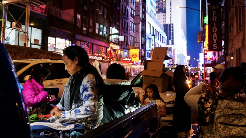 Phillips and the other volunteers pulled up at the homeless shelter — a hotel turned city shelter — a block east of Times Square around 6:40 p.m. Migrants streamed out of the hotel and began picking through sweaters, fleece blankets and snacks inside the boxes.