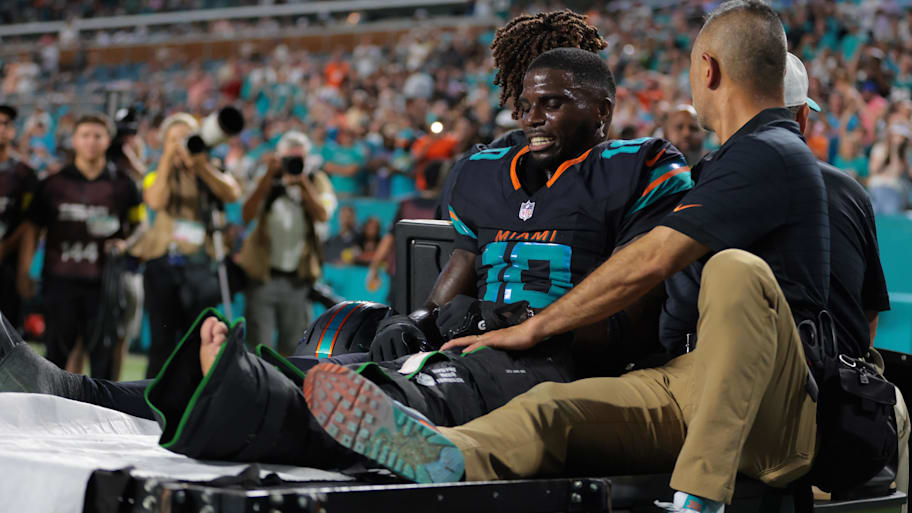 Hill suffered the injury early in the third quarter after catching a pass and getting tackled out of bounds. He was carted off the field, and McDaniel said after the game that Hill suffered a dislocated knee. Hill was taken to the hospital in an ambulance and will stay there overnight.