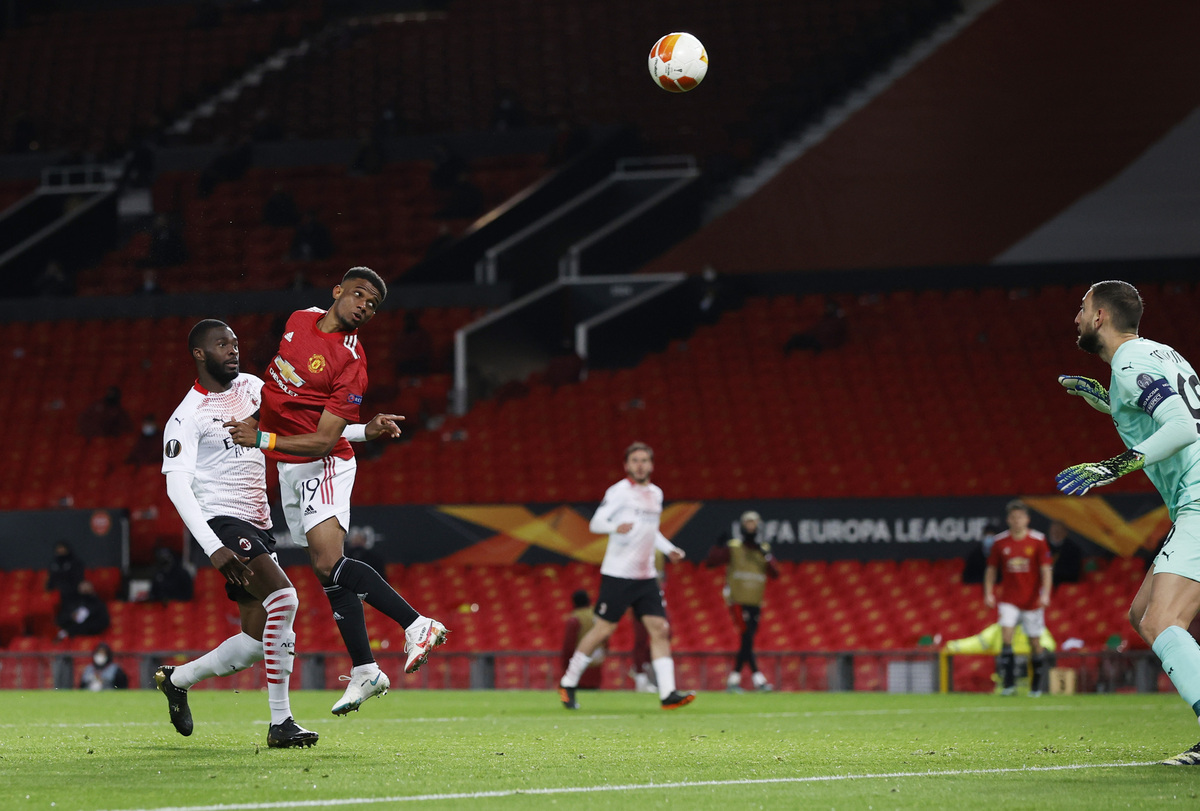 Picked out by a lofted ball from Bruno Fernandes he found the net with a smart back-header over Milan keeper Gianluigi Donnarumma.