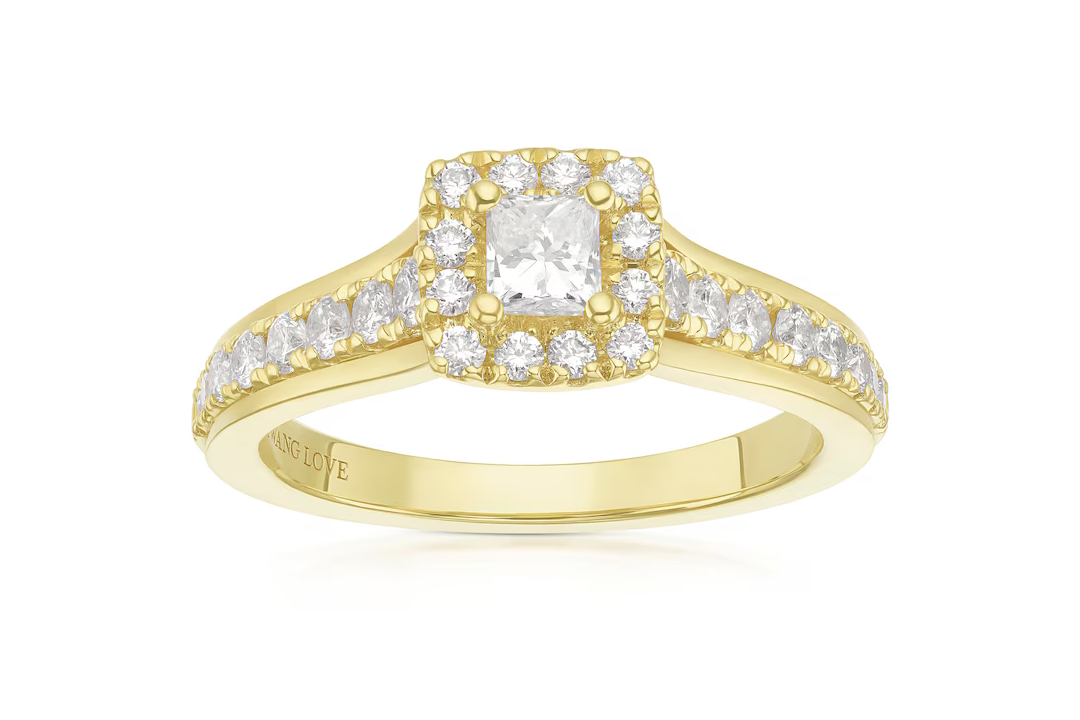 Vera Wang 18 carat yellow gold 0.69 carat diamond princess cut halo ring: £3,000, Ernestjones.co.uk