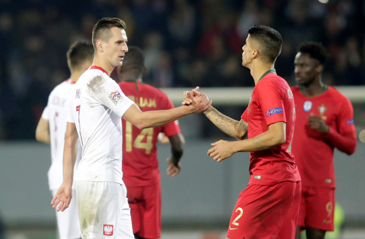 Soccer Football - UEFA Nations League - League A - Group 3 - Portugal v Poland - Estadio D. Afonso Henriques, Guimaraes, Portugal - November 20, 2018 Poland's Arkadiusz Milik shakes hands with Portugal's Joao Cancelo after the match REUTERS/Miguel Vidal
