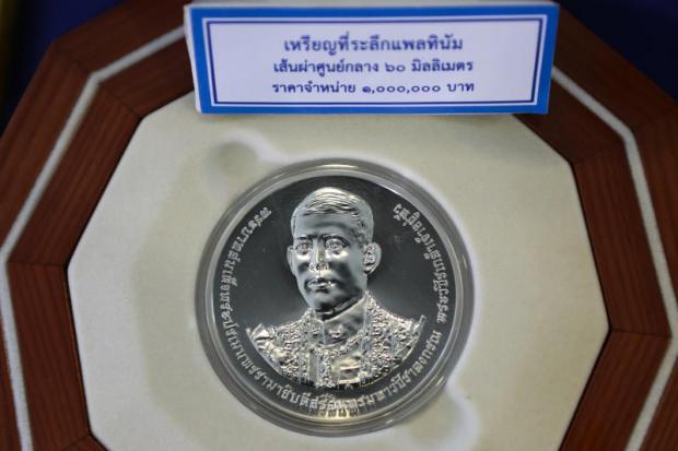 The platinum coins are being sold as a set of three with no value engraved. The other two are made of blackened silver and copper, worth 5,000 and 3,000 baht, respectively.