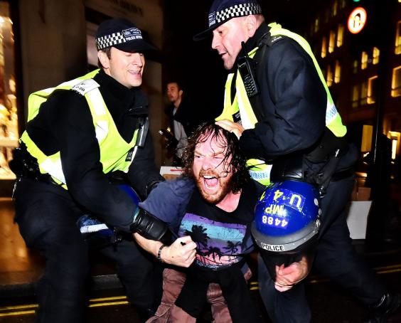 Several bloodied people were seen being treated by emergency crews and mounted officers formed human shields around sections of Westminster closed off to surging protesters.