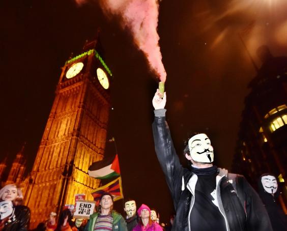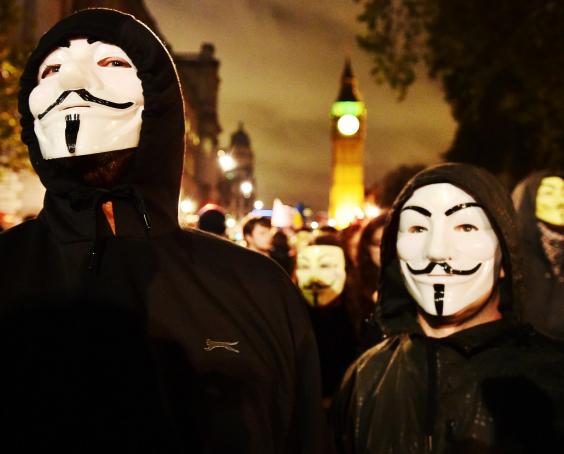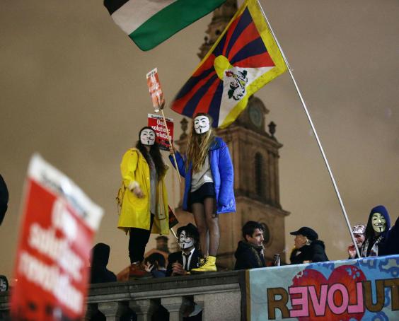 The march, organised by hacktivist group Anonymous to protest against government cuts, started peacefully with singing and chanting at Trafalgar Square from people wearing "Guido" masks.