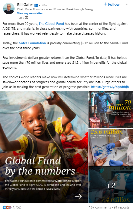 The US$912 million will flow into the Global Fund's fight against AIDS, tuberculosis and malaria, as well as into innovations such as long-acting HIV treatments. Gates also name-checked groups like Gavi, the Vaccine Alliance, which play a central role in building health systems that can withstand shocks.