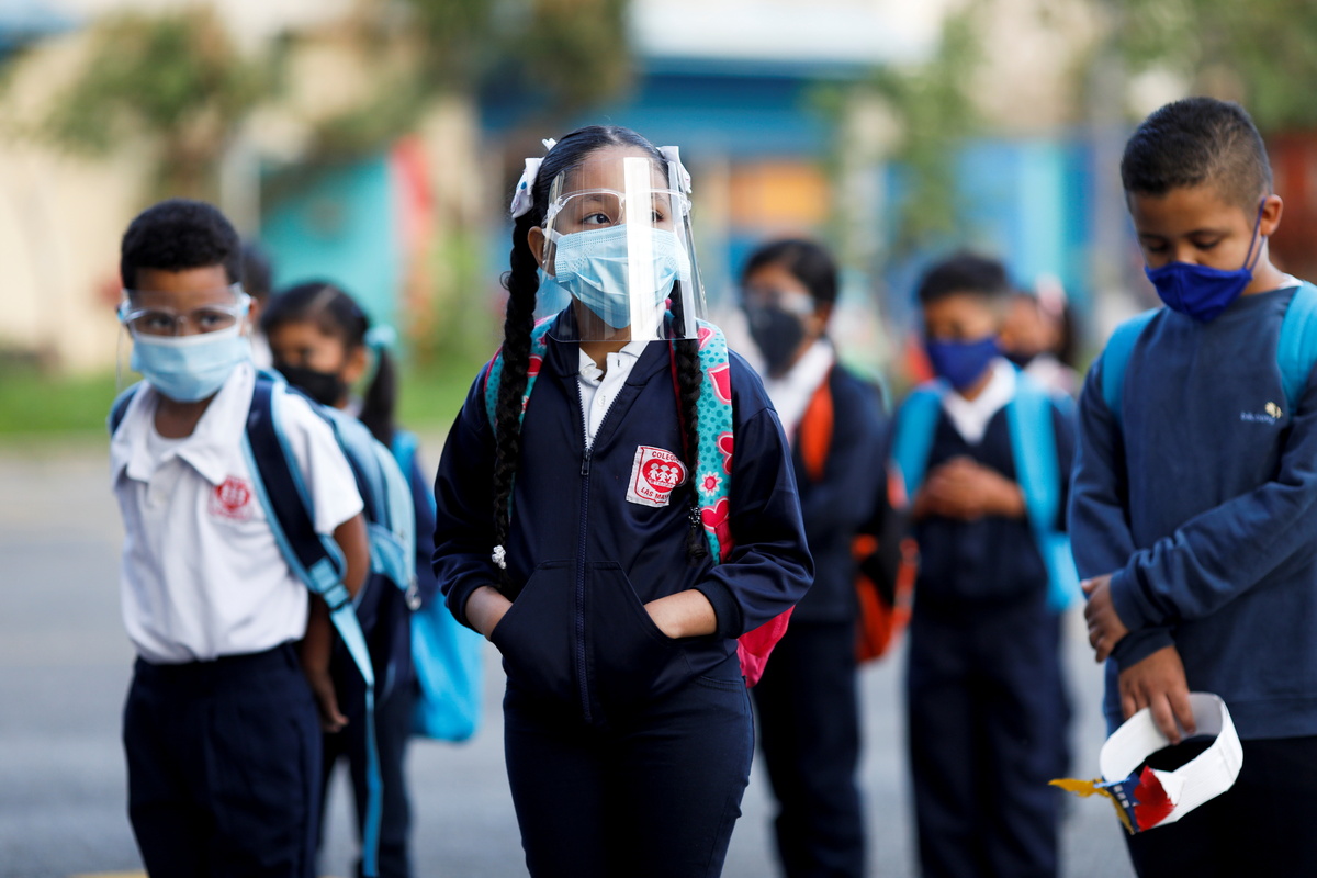 Children dressed in uniforms of blue pants and red shirts and wearing masks filed into schools in the capital Caracas starting at 7 a.m., as teachers dispensed antibacterial gel.