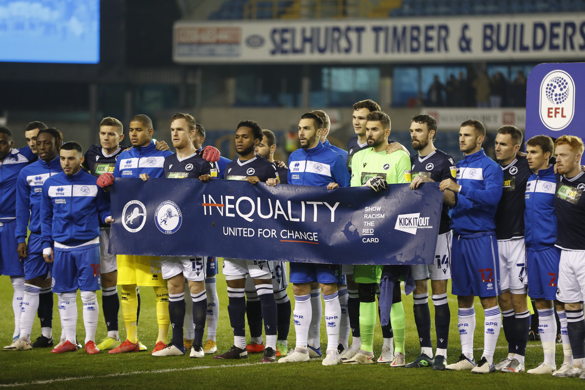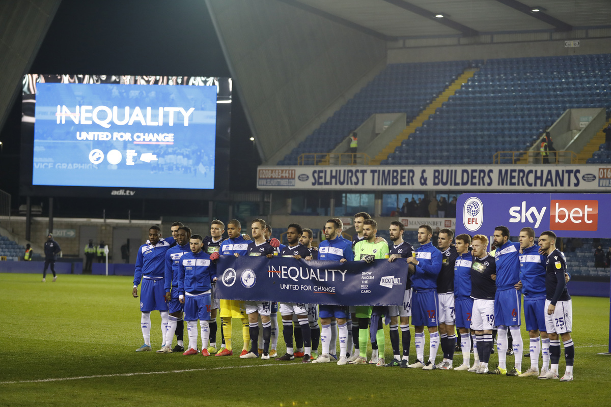 The home players at The Den, stood together with their opponents before Tuesday's game holding a banner stating 'Equality - United for Change' and received a warm welcome from the 2,000 fans permitted inside the ground.