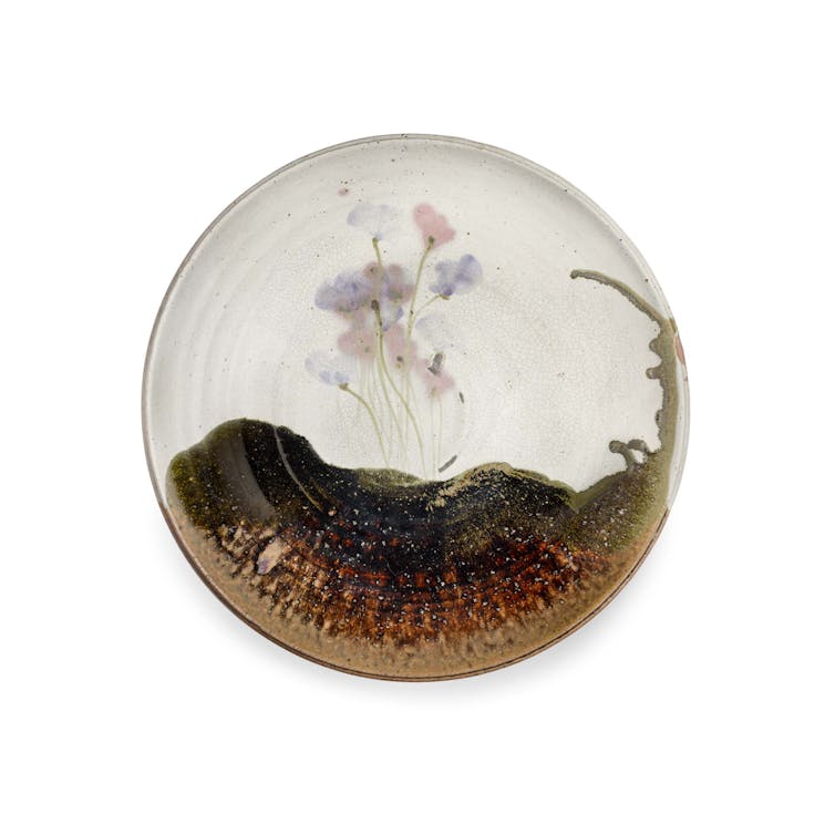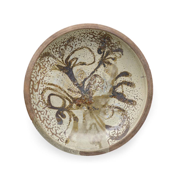 On display are a series of ceramic landscape platters that point to those deep changes such as Plate with blossom pattern, 1978. Its abstract marks meld an Australian landscape base with finely drawn blossom, while the calligraphic gestures on his Dish, 1982, point to a deep infusion of a Zen way of thinking and making.
