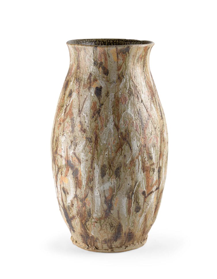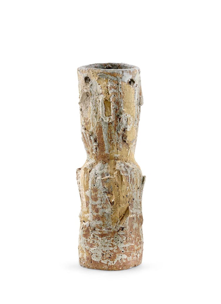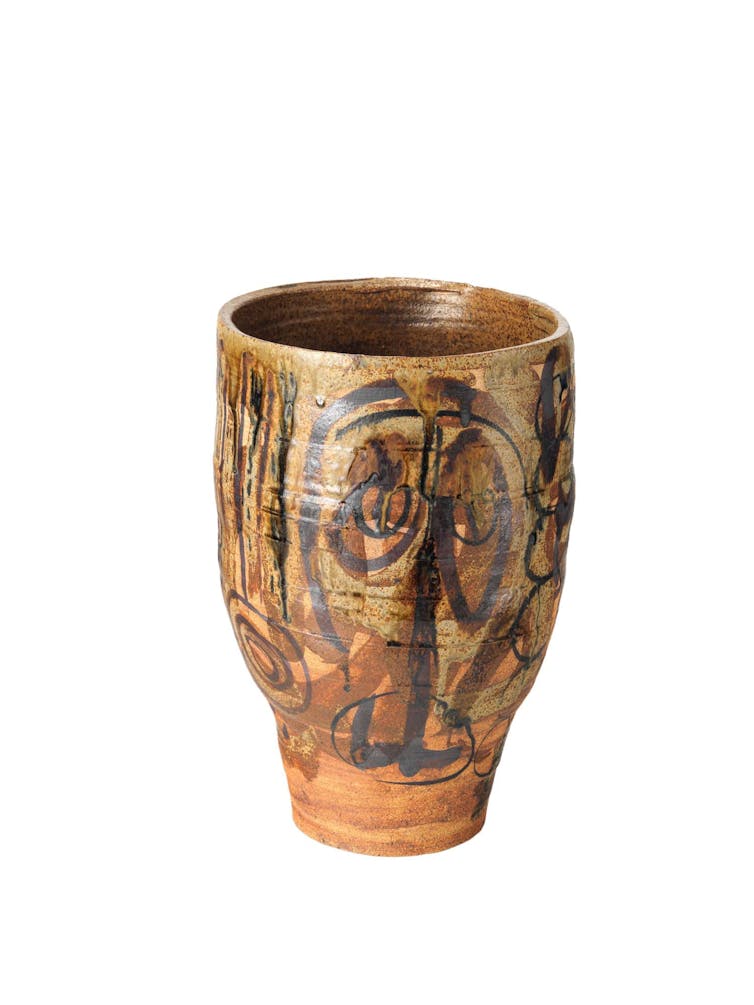Studio ceramics – with its hallmark folk tradition, figurative form and applied decoration – appears briefly in some early Moon work such as his Sculptural vase, 1960. Owl-like, the eyes at the top look down on viewers, while the decorative markings double as plumage and drawing on clay.