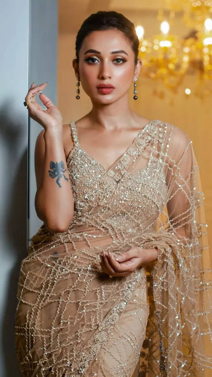 The 33-year-old actress looks goddess in this sheer embellished champagne saree.