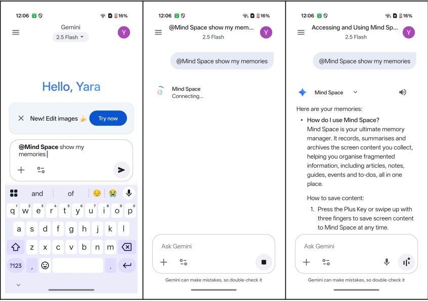 Users will walk through an onboarding process about Mind Space's AI Brain capabilities, a consent screen for Gemini's assistance, notifications, and a beta sign-up (for the Mind Space Extension) before confirming everything. Hope back into the Gemini app > Apps Page and make sure the Mind Space app is enabled, then you're all set.