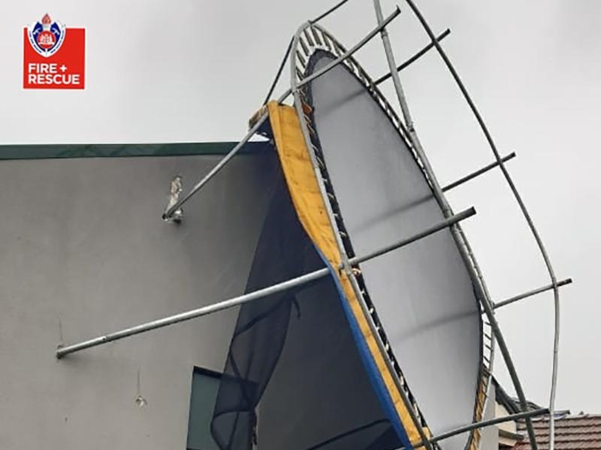 Photos of the damage show a trampoline with its legs impaling the side of a house.