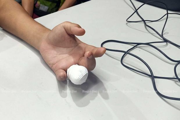 He said he took the No.82 bus (Pahurat-Phra Padaeng), which provides a public service but is run by a private company, from his school near Pak Khlong Talat to his house in Samut Prakan. As he was getting off near Phra Padaeng intersection, the back automatic door unexpectedly closed and cut through the bone of his left ring finger just above the third knuckle.