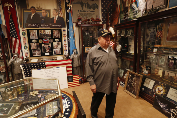 Crooks, a Navy Vietnam veteran, pays patriotic tribute to all the military branches, including a life-size mannequin dressed in an Army uniform and ready for action. Crooks organizes, arranges and decorates each space himself. "I dust every one of the cases," he said.
