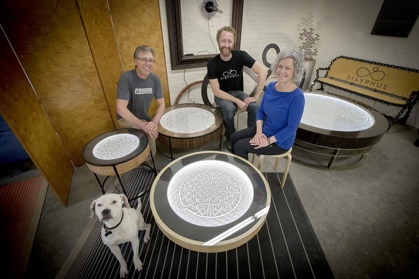 The metal and wood veneer tables will be assembled starting this spring in a building in northeast Minneapolis that also houses Nordeast Makers, a maker space that Shapiro helped start with Micah Roth, who is the chief operating officer for the Sisyphus project. Trombley is the chief financial officer.