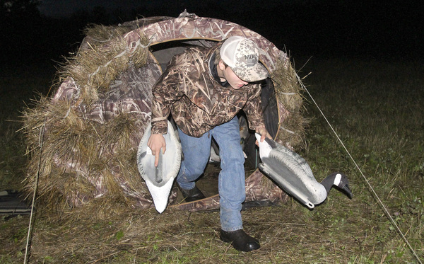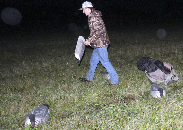 Shortly after 6 a.m., he pulls a few goose decoys from his portable blind in the hayfield. With Trooper bouncing along, he places the decoys in two pods. Light mist falls in the still-black morning. Ellerman works quickly, without a headlamp, until he has about 15 decoys near his blind. They resemble resting Canada geese and look good on the green grass.