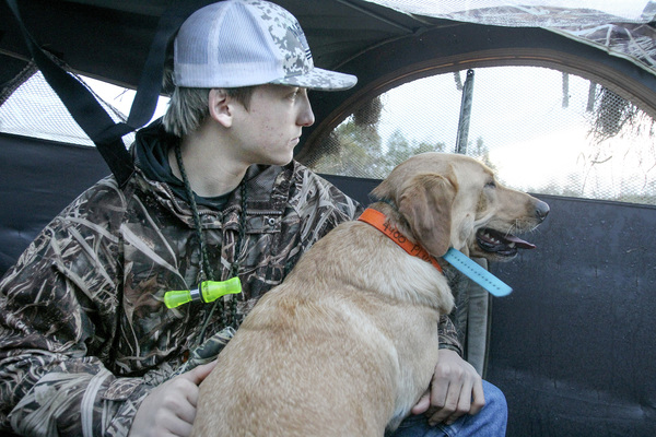 Ellerman and Trooper, all 80 pounds of him, take their places in the blind, which is built to look like one more bale in the hayfield. In the grudging daylight, one can just make out a few hay bales, an apple tree and a small pond. Ellerman pulls his rack of goose and duck calls from his pack and slings them around his neck.