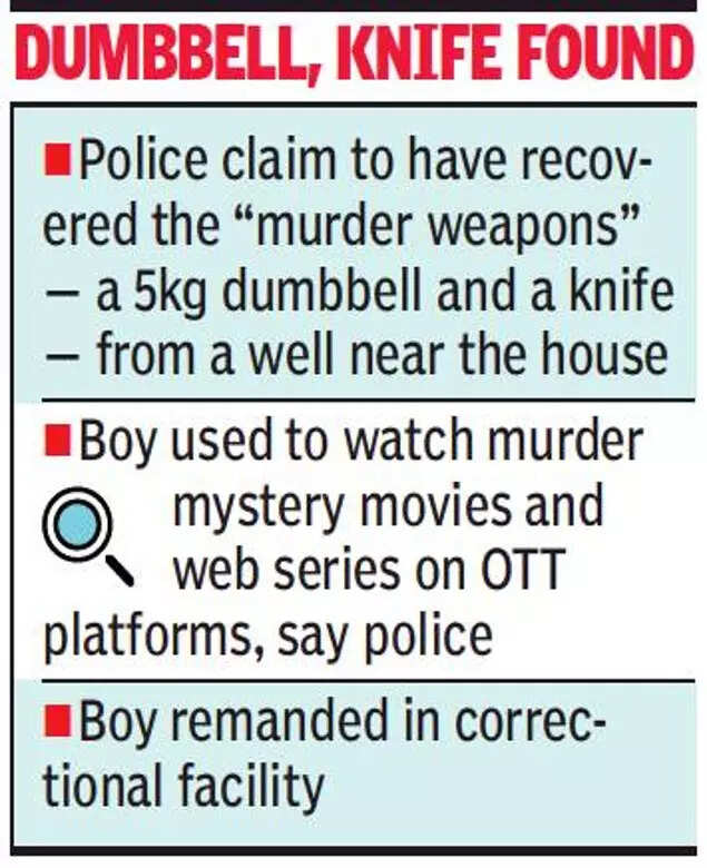The boy also led the police to the recovery of the “murder weapons” — a 5kg dumbbell and a knife allegedly used in the crime and a towel used for cleaning the bloodstains — from a well near their house on Monday afternoon after a hectic search conducted with the help of the fire brigade.
