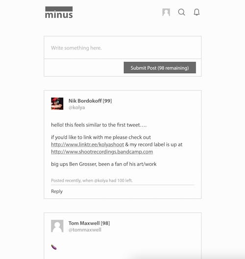 The social network looks a lot like Twitter, with a simple feed that shows the most recent posts first. Users can also reply to one another, but that’s where the two diverge. Minus has no engagement statistics, like retweets — the only stat is a countdown showing how many posts you have remaining — and there’s no algorithm to try and keep you engaged with posts you might like.