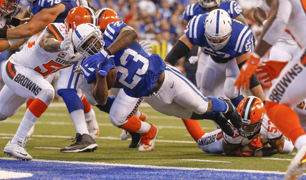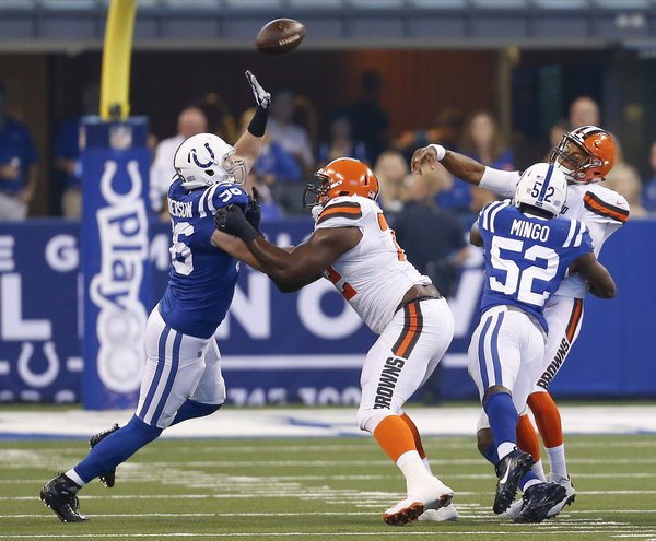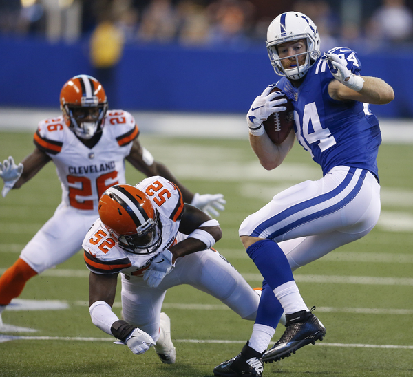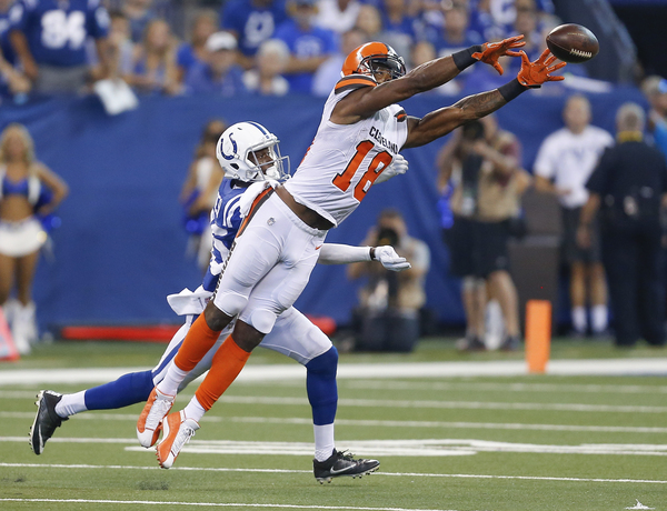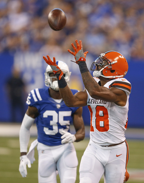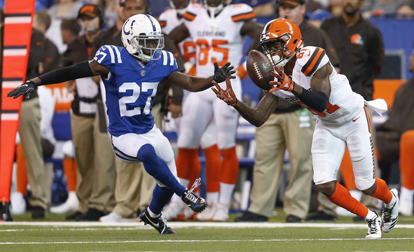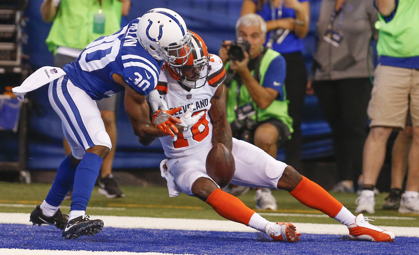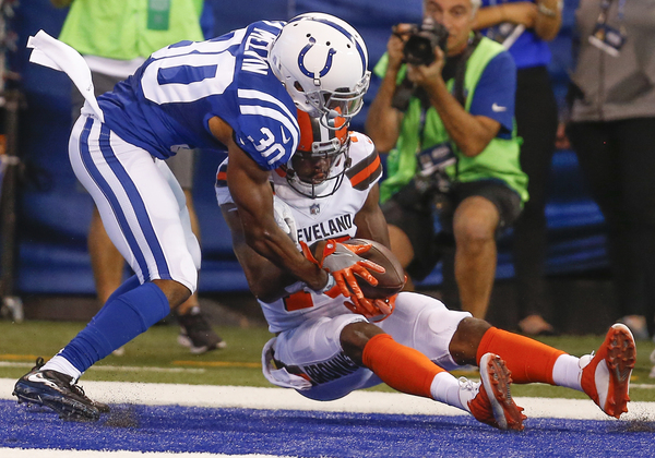 On second-and-1 at the Colts 28-yard line, Browns wide receiver Jordan Leslie made a circus catch, using one hand to haul in a 26-yard pass with Melvin in his face, to set up the score.
