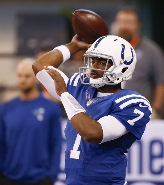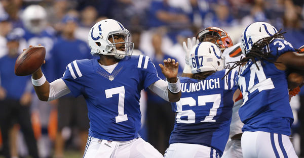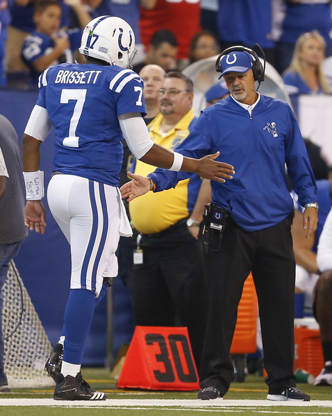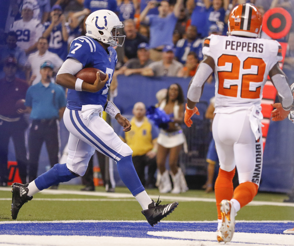 The Colts scored their first two touchdowns on runs by quarterback Jacoby Brissett, who went 17-of-24 passing for 259 yards and a touchdown for a rating of 120 and rushed five times for 14 yards and two touchdowns with three sacks taken.