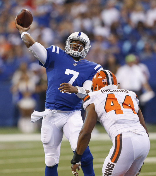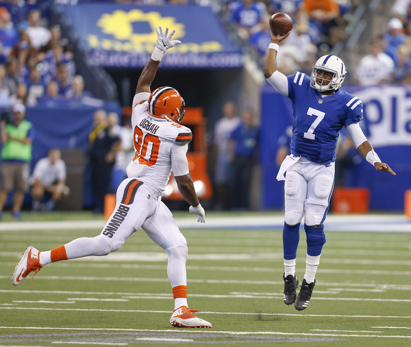 Later, they went ahead 14-7 when the Browns got pressure on Brissett but he scrambled out of danger for a 7-yard touchdown run with 10:06 left in the second quarter. Earlier during the six-play, 75-yard march, a controversial roughing the passer call on Browns defensive end Nate Orchard gave the Colts first-and-10 at the Cleveland 15.