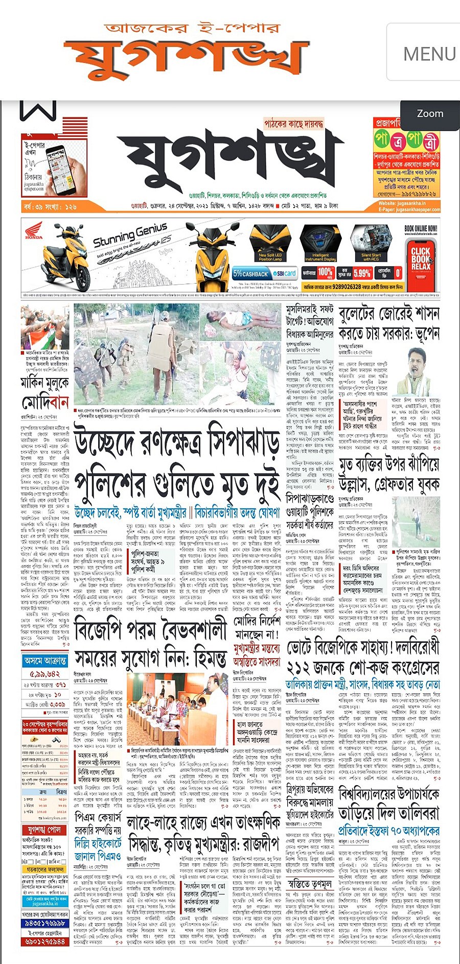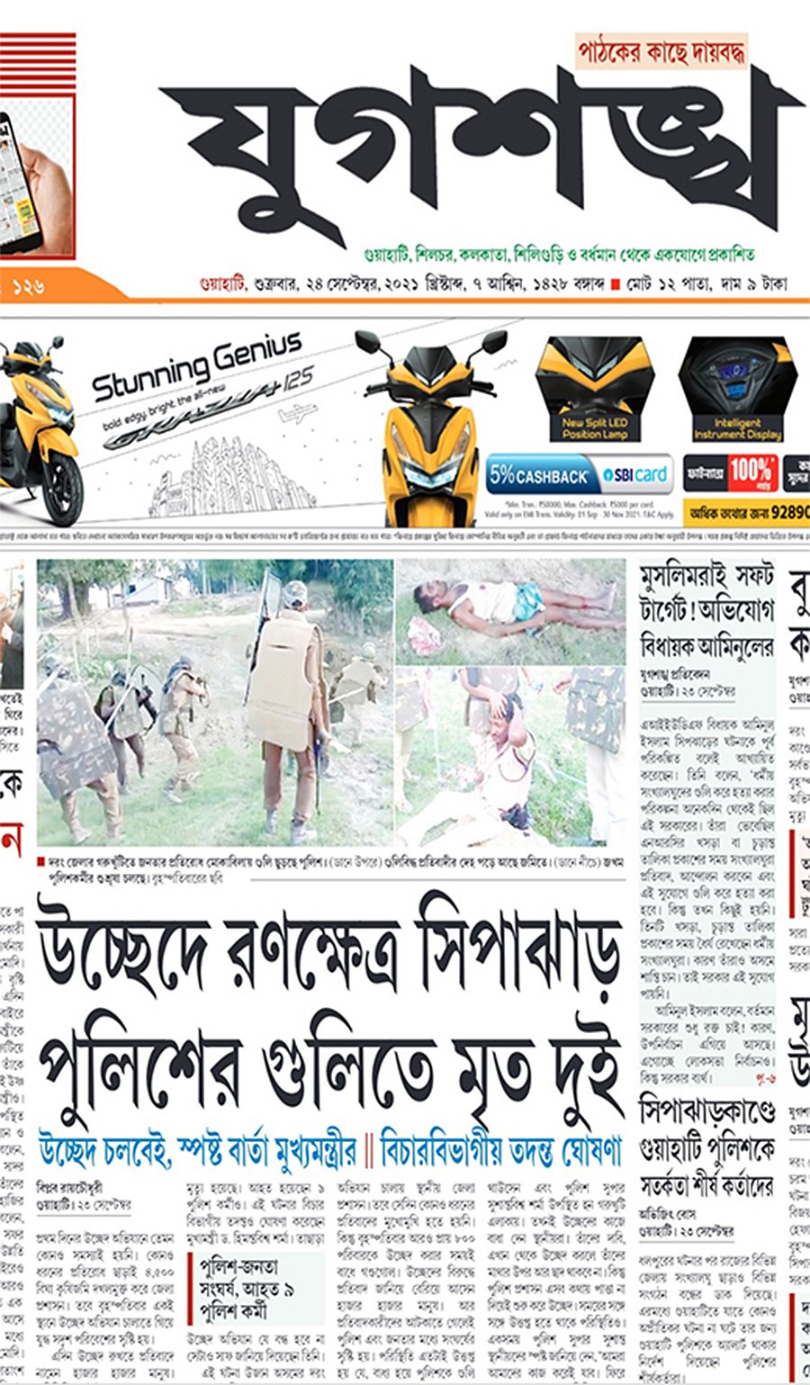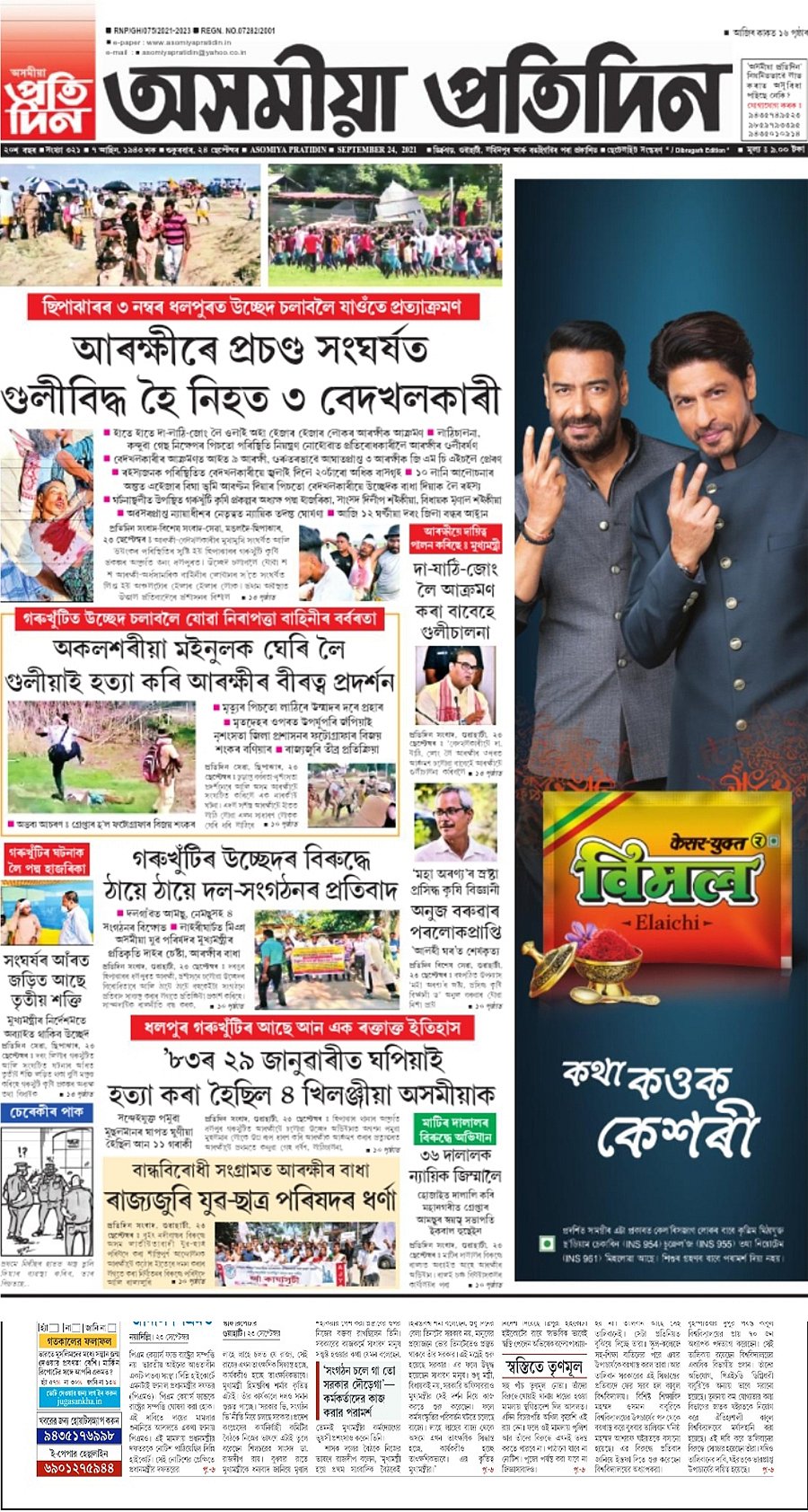The leading Bengali language daily of Assam, Jugosankha, led with a similar photo package, in this case with three images. The first showed policemen firing, though their target is not visible. The second showed the man lying dead. The third showed an injured policeman. “Sipajhar battleground in eviction, two dead in police firing” the headline said. The strap mentioned that the chief minister has declared the eviction drive will go on, and there will be a departmental inquiry into the incident.