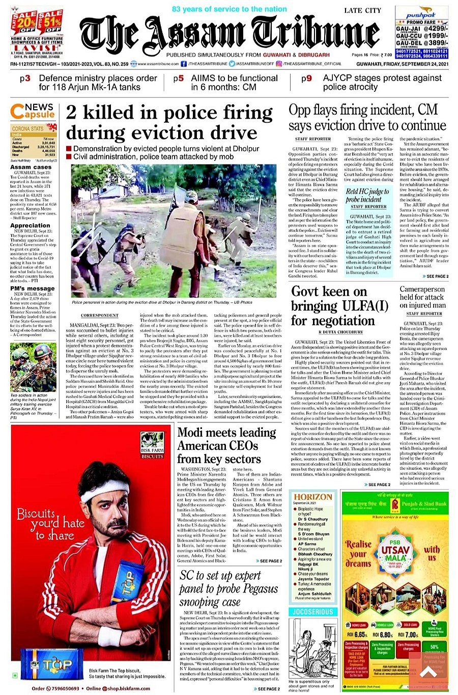 The state’s leading English daily, the Assam Tribune, had a single image of the police firing at an invisible target in its lead package. “Two killed in police firing during eviction drive” said the lead headline. Two bullet points below in a strap below the heading said “Demonstration by evicted people turns violent at Dholpur” and “Civil administration, police team attacked by mob”.